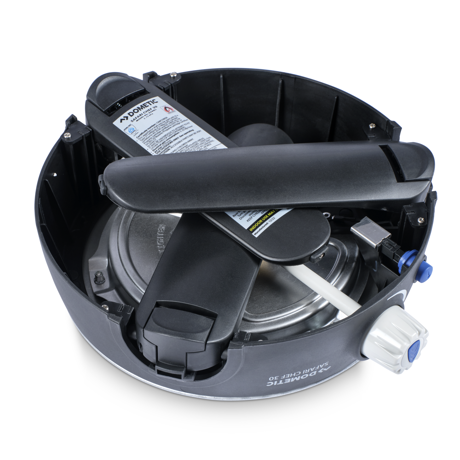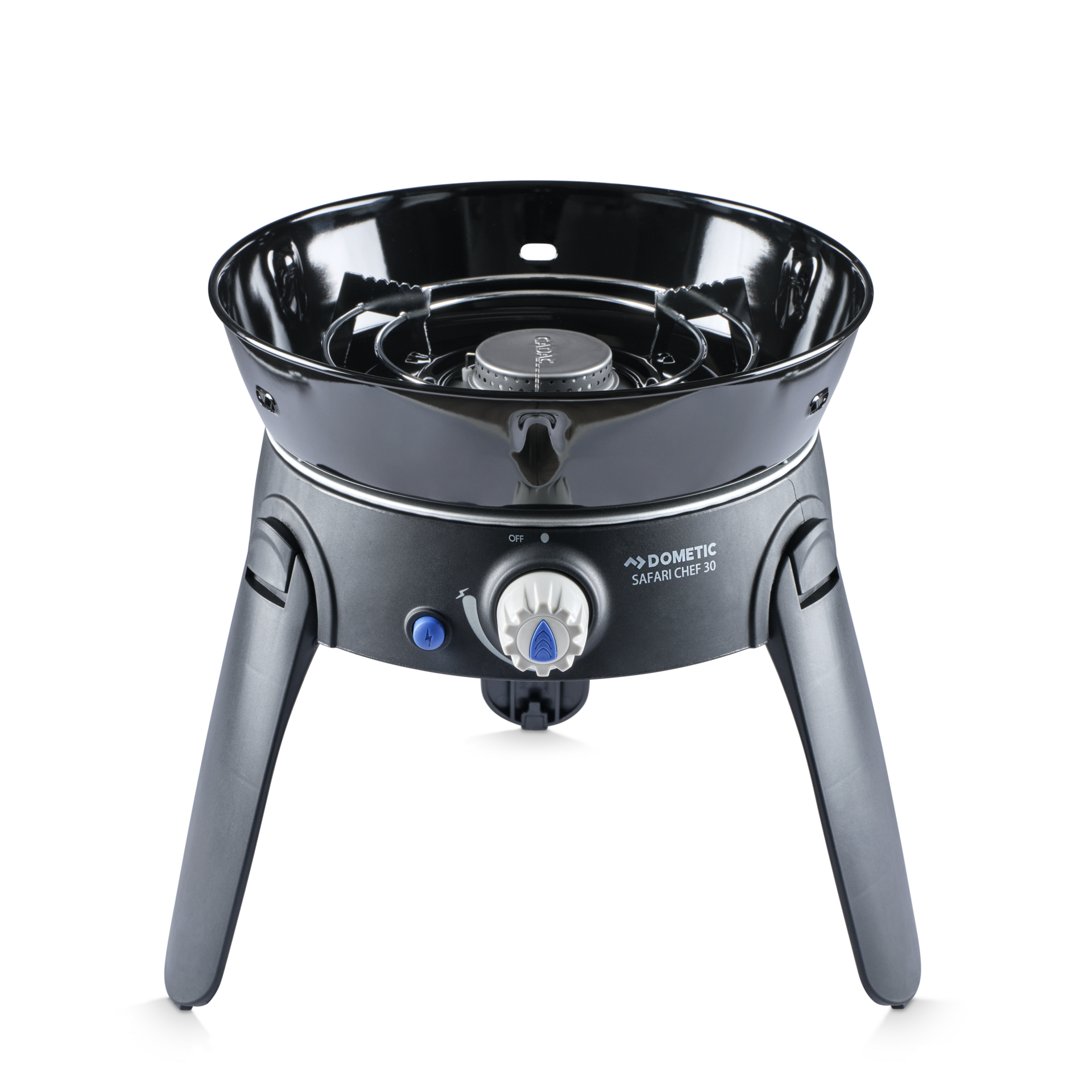 This compact and lightweight barbeque weighs just 4.7kg and comes with four different cooking surfaces. The removable fat pan catches cooking residues, but at the same time acts as a windshield to protect the Safari Chef’s burner. The barbeque comes with a convenient carry back for easy transportation. The Safari Chef 30 works with a hose and pressure regulator. This is an ideal barbeque for use at the campsite, on the balcony or in the park.