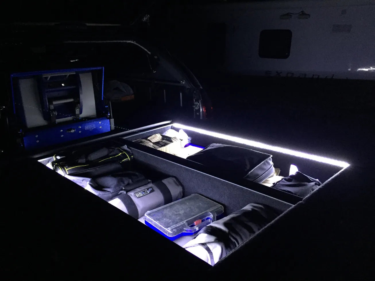 The patented “Stay-Open Block” allows the drawer to remain in an open position even on a 30-degree slope. They also feature an LED Light Strip that activates at full extension and has a manual override switch. A 100% safe and secure lock system that can not be levered open from underneath, is an exceptional security measure. Dust resistant seals around front panels ensure all the items stored inside stay clean and dust free. Flush-fitting wing kits are available for most 4WDs and utes, creating additional storage space between the Storage Drawer System and the inner sides of the car. Access to the space is gained through removing the wing and face panels. The reinforced wing kit brackets provide a fully supported base for fridge slides to be mounted onto the wing panels, allowing for more placement options.