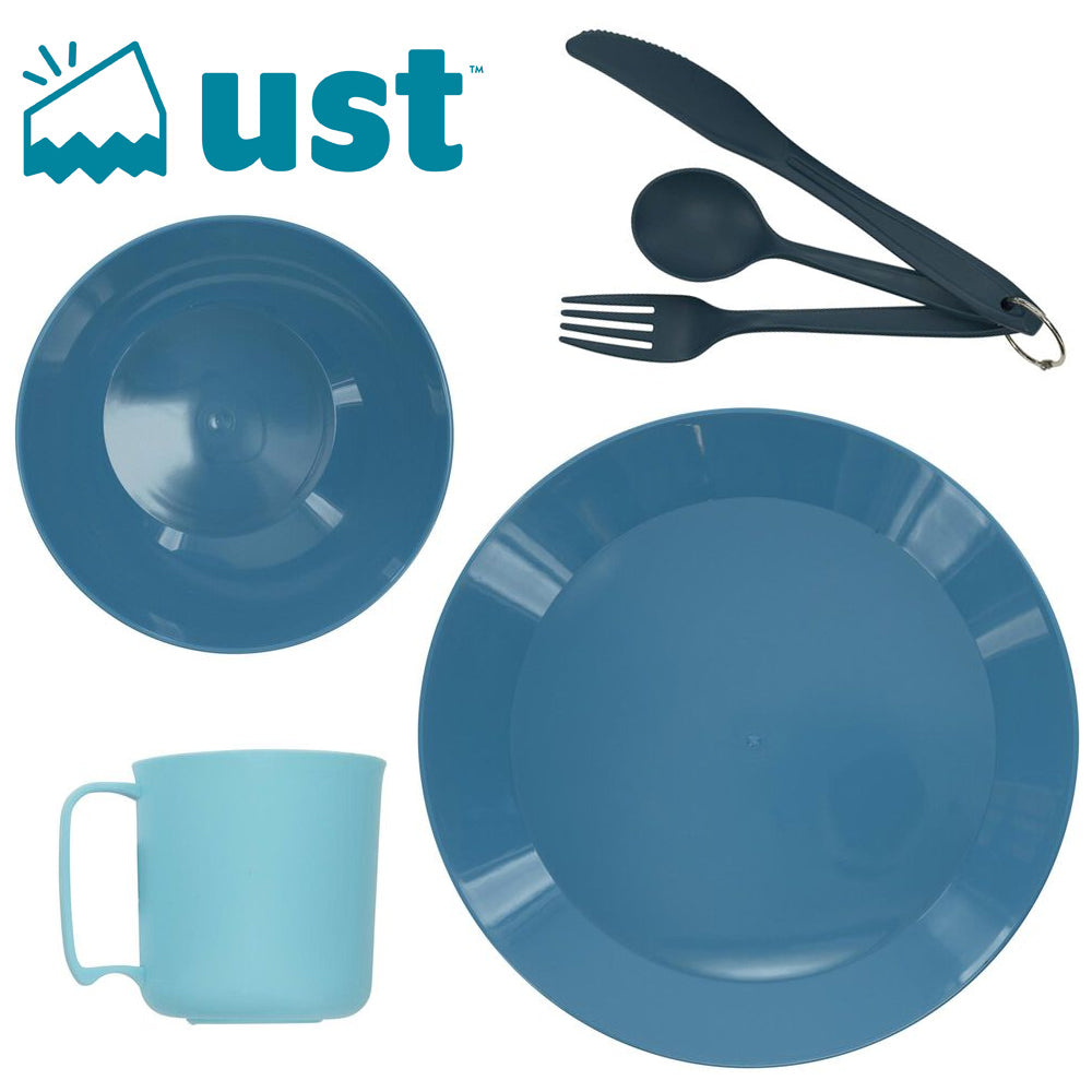The UST PackWare Dish Set is all one needs when hiking, backpacking or camping. This dining kit includes a plate, bowl, cup, fork, knife and spoon, and has a mesh bag to transport it in comfortably. Lightweight and durable construction, this dish set for one is what you are looking for.