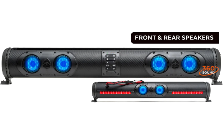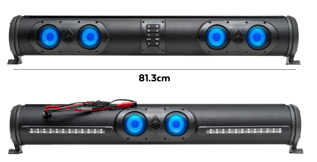 The new 32" SoundExtreme powersports sound bar with 360 degrees sound and LED lighting system is perfect for your 4WD, ATV/UTV, boat, and golf cart. 100% waterproof, dustproof, and dirtproof. 500 watts of power to 11 marine grade speakers provide a great listening experience.With our EcoCast feature connect up to 100 Sound Extremes at a time! Patent Pending.